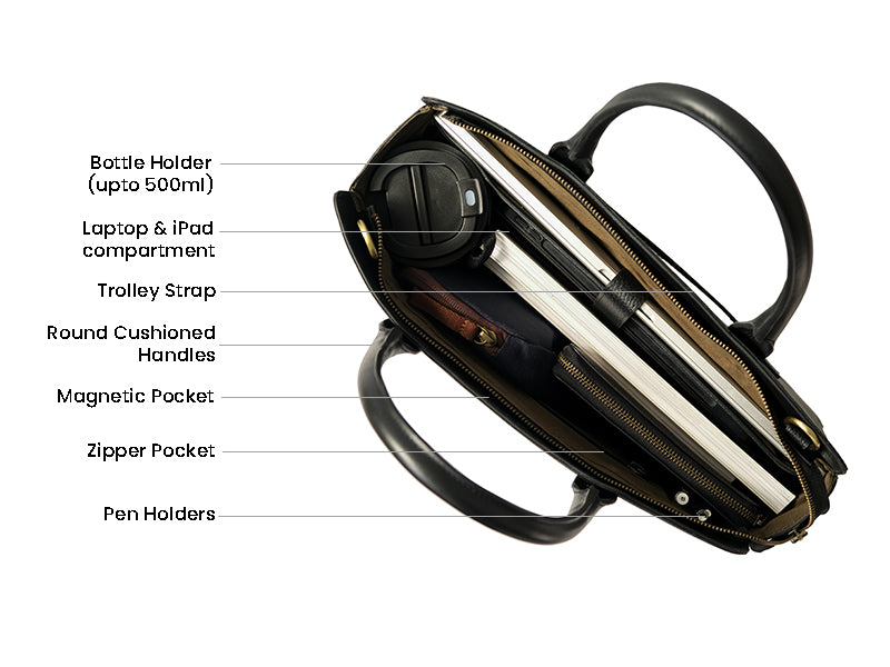 Securely stores laptops upto 16" and an iPad upto 12.9". From an intuitively designed pocket to store a bottle of water to an external pocket for quick access to your phone. A raise inner zipper pockets aids in securely storing important essentials.