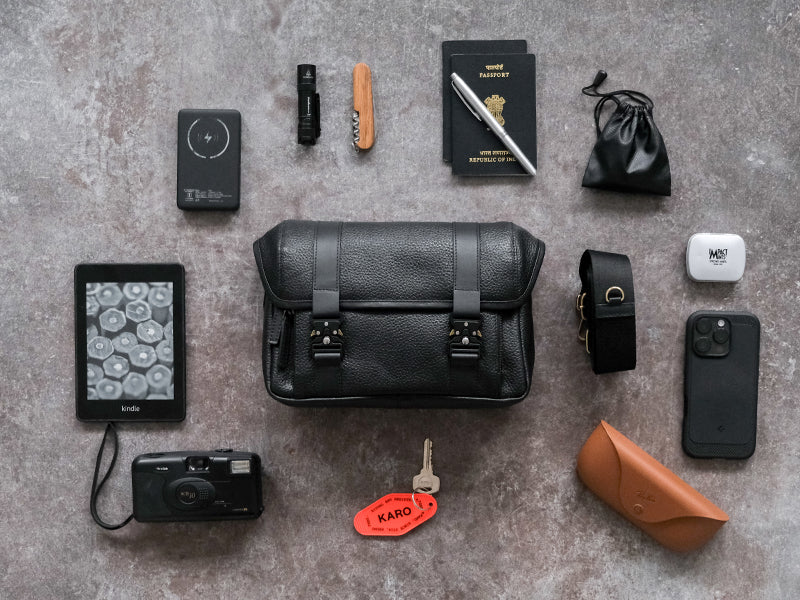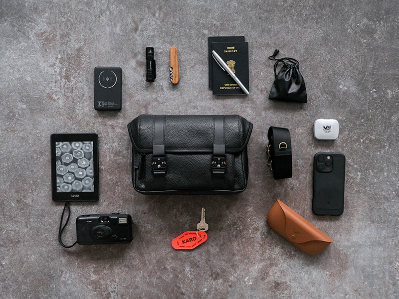 There is room for all. Neatly stack all your essentials under a secure flap and metal lock mechanism.