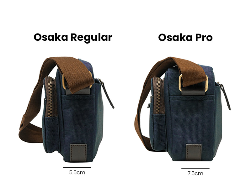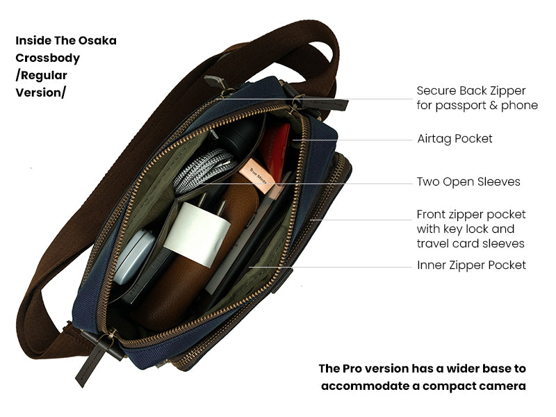 Osaka Crossbody Pro: Larger padded center compartment to carry a compact mirrorless/DSLR camera such as the Fujifilm XT4, Nikon Zf and more.
