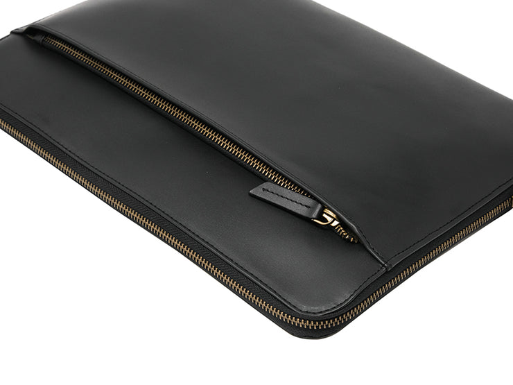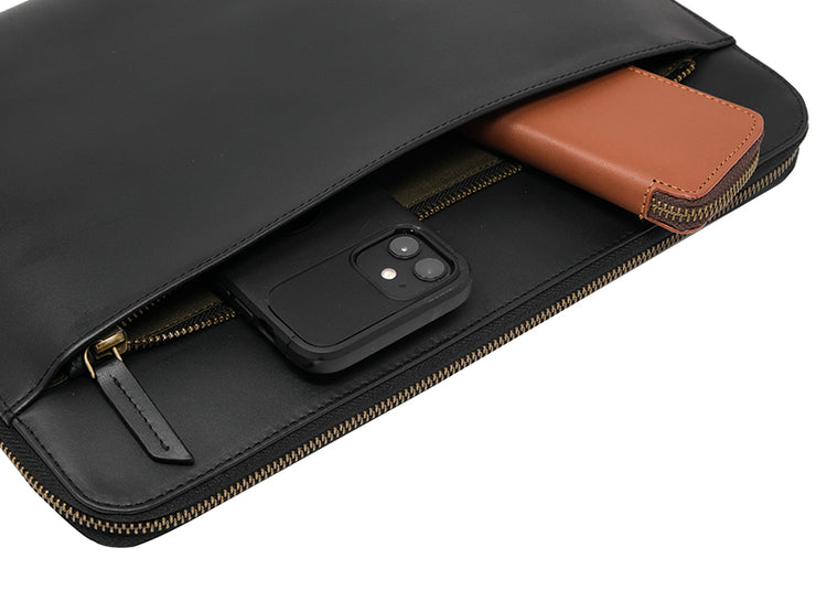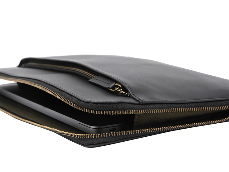 A sleek leather laptop sleeve in a minimal, classy silhouette designed to carry your laptop & charger plus your everyday essentials.