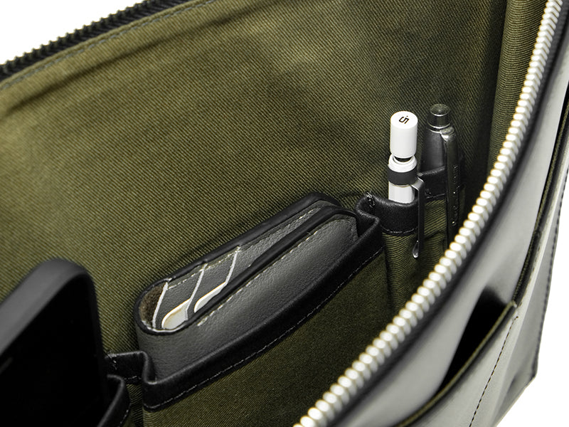 • Two open sleeves and pen sleeves inside the main zipper compartment