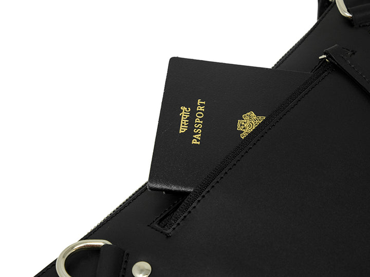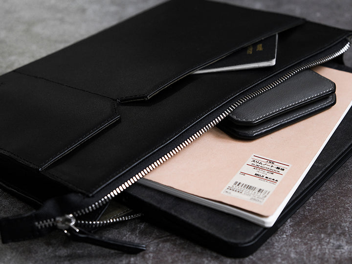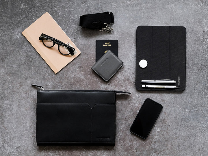 Wallet, Passport, iPad + Keyboard, Pens and more sitting neatly behind a closed zipper.