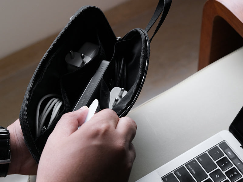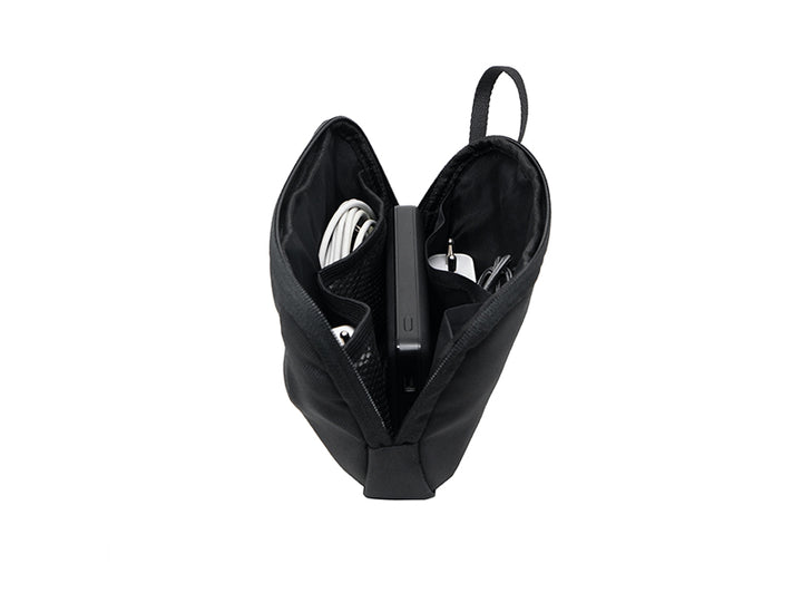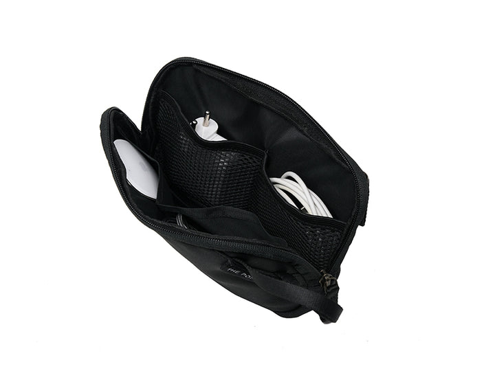 Quick access storage for memory card readers/USB cables. Mesh pockets on the inside that come with a pinch of elasticity to bigger chargers.